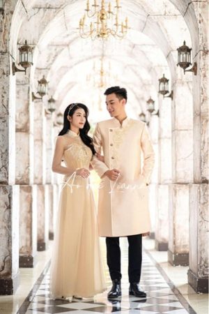 Áo dài cưới được đặt may theo số đo (customized in about 5 weeks).