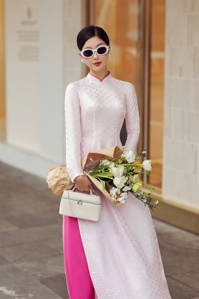 Áo dài truyền thống hồng phấn viền cổ hông sen