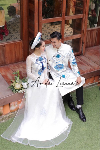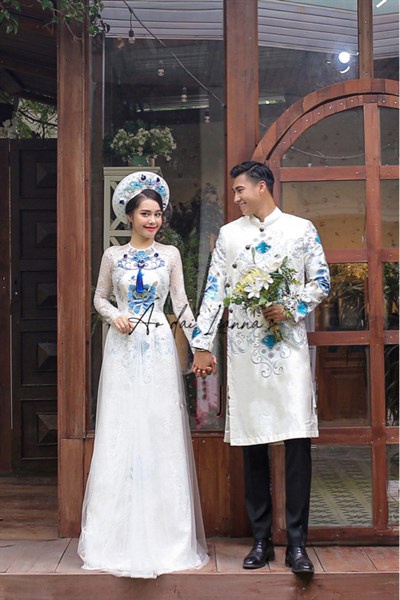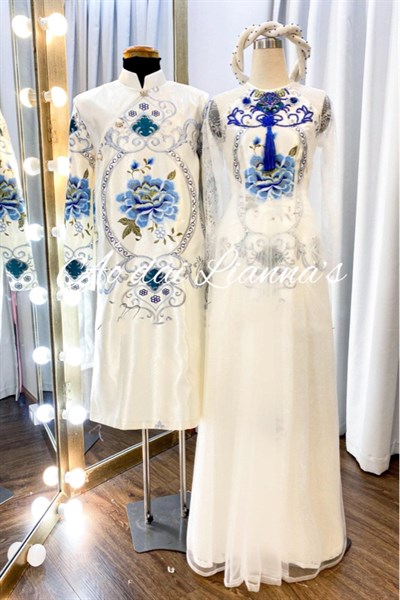 Set áo dài cưới thiết kế trắng phối xanh dương