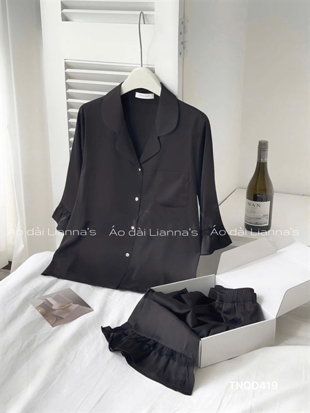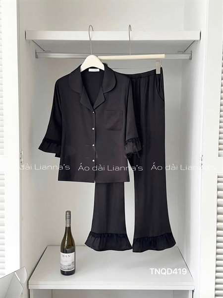 Set lụa tay ngắn quần dài tay bèo màu đen