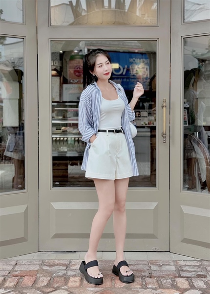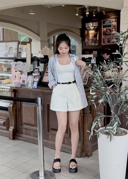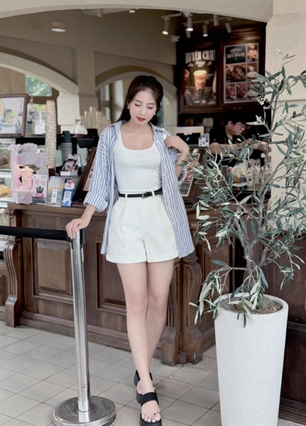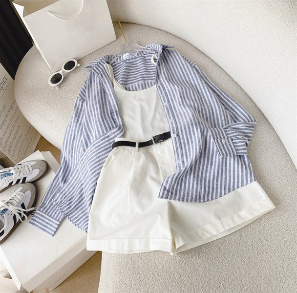 Set sơ mi sọc xanh quan trắng kèm belt quantity