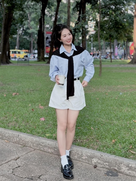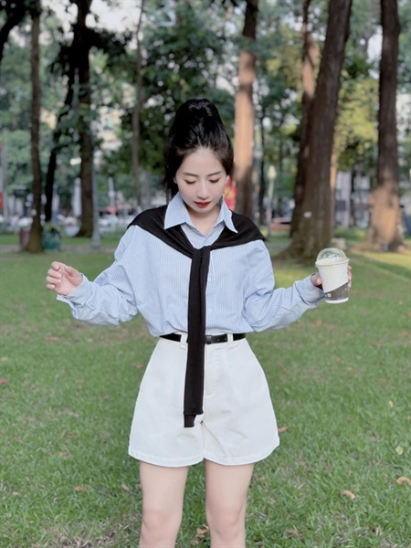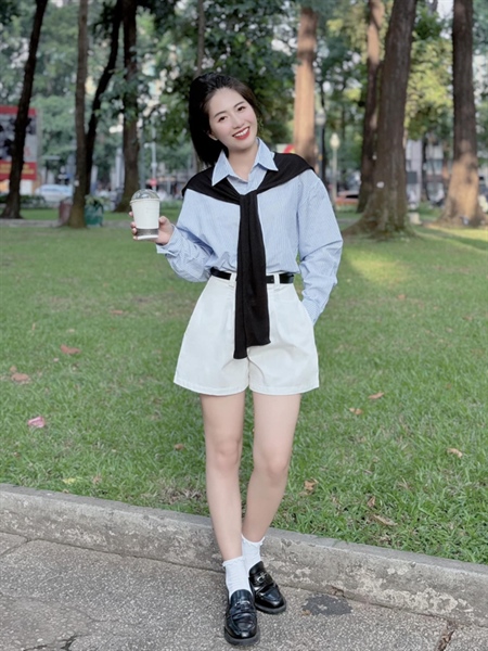 Set sơ mi xanh quan trắng kem khăn cổ quantity